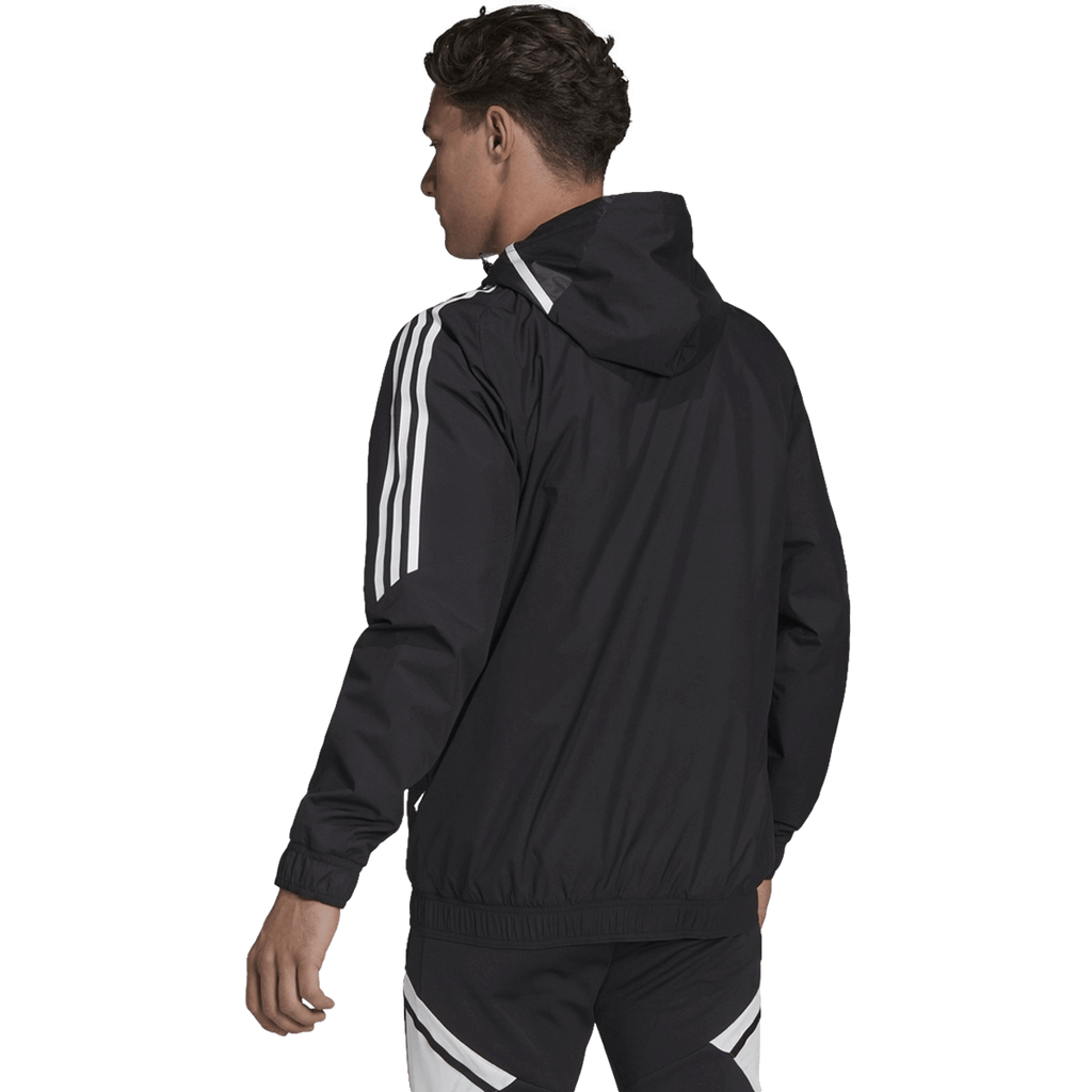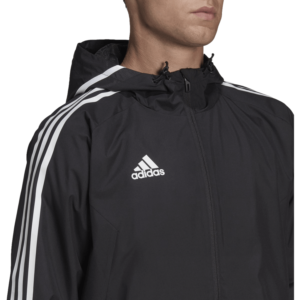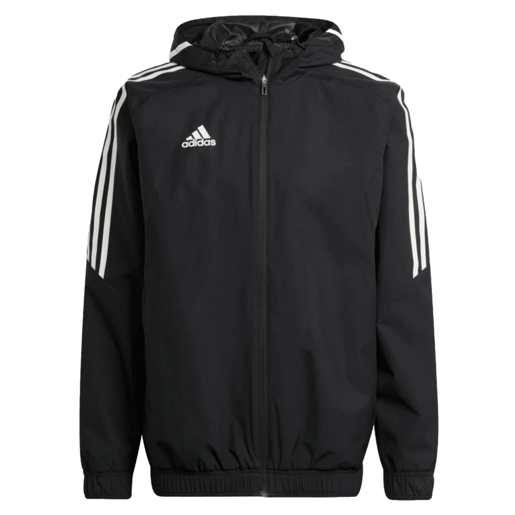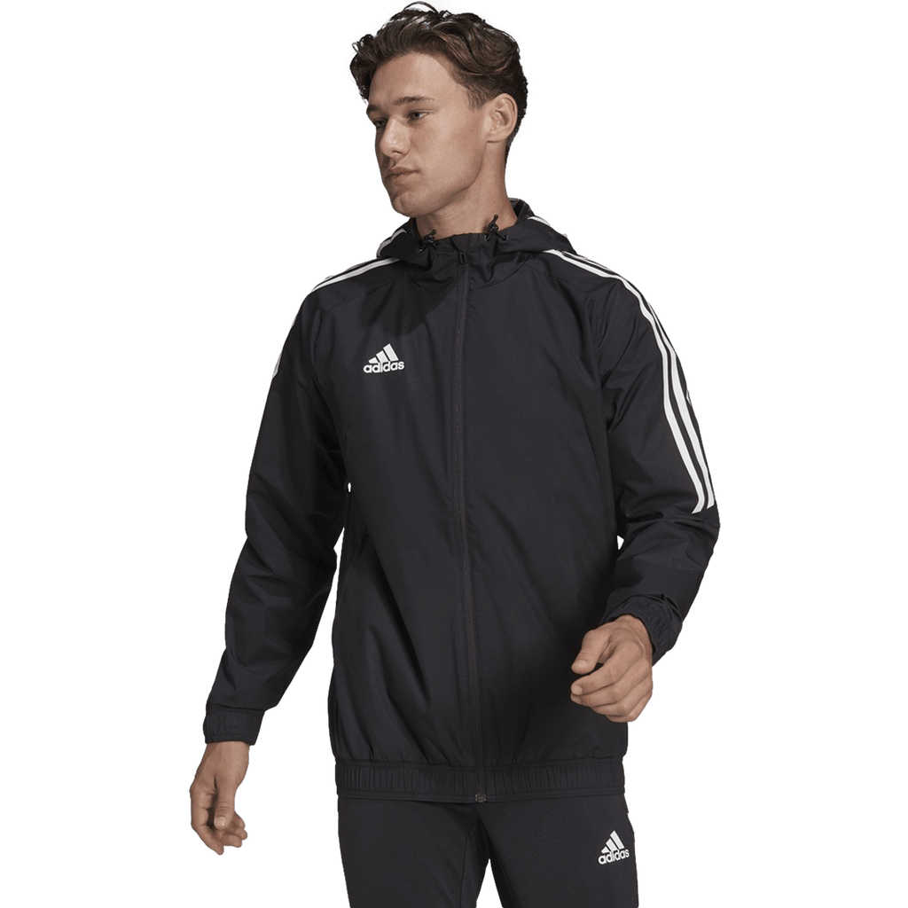 Features/Benefits: The weather is just another opponent to be bested. This adidas soccer jacket lets you train through light showers and drizzle. Its bungee-adjustable hood and elastic cuffs help keep out the elements. Zip pockets ensure your possessions stay dry.