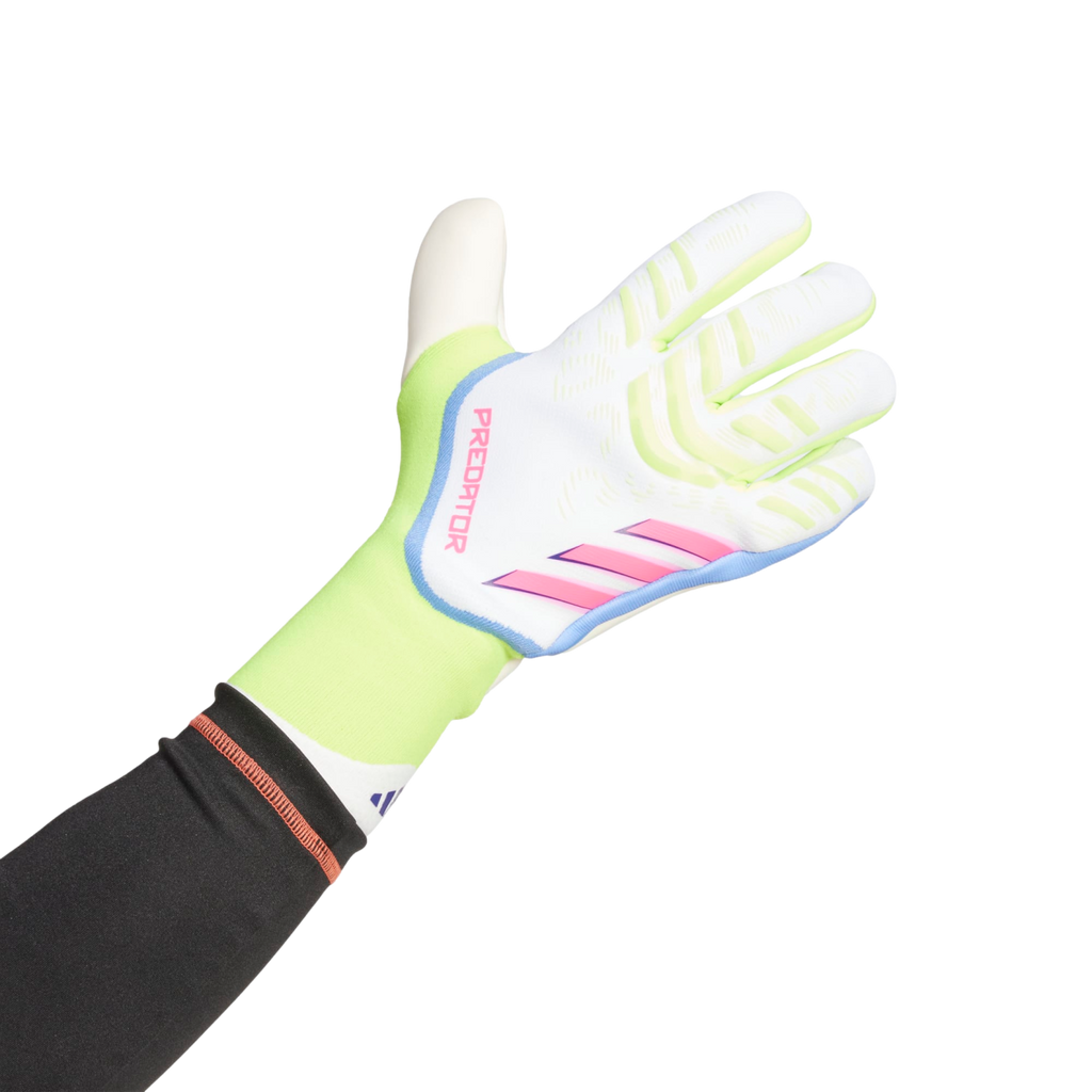 Get to the ball every time in these adidas Predator Pro goalkeeper gloves. With grippy URG 2.0 latex palms and a snug, negative finger cut, they're engineered for imperious match day performances. The adaptive knit backhand includes silicone elements for pinpoint punching, and a strapless entry provides a natural-feeling fit at the wrist.