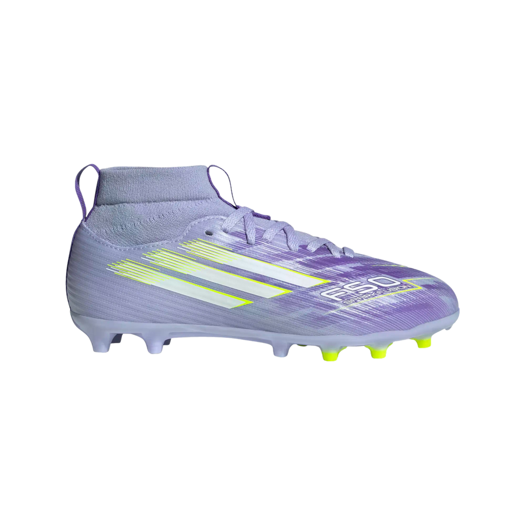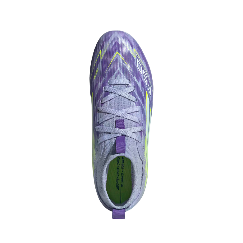 Designed for her. Light up the pitch in supportive F50 Sparkfusion cleats created specifically for female athletes. These juniors' adidas League cleats have a soft Fiberskin upper for comfort, a specially shaped last for the perfect fit, and a Sprintplate Fusion outsole that supports women's biomechanics. The result? Footwear that will help you fulfill your soccer potential on firm ground and artificial grass.