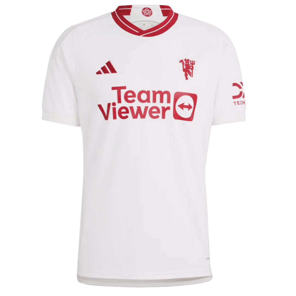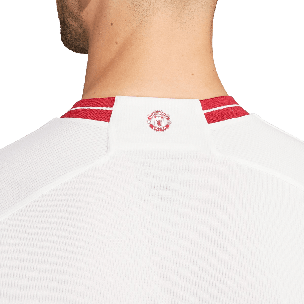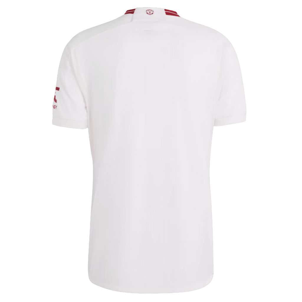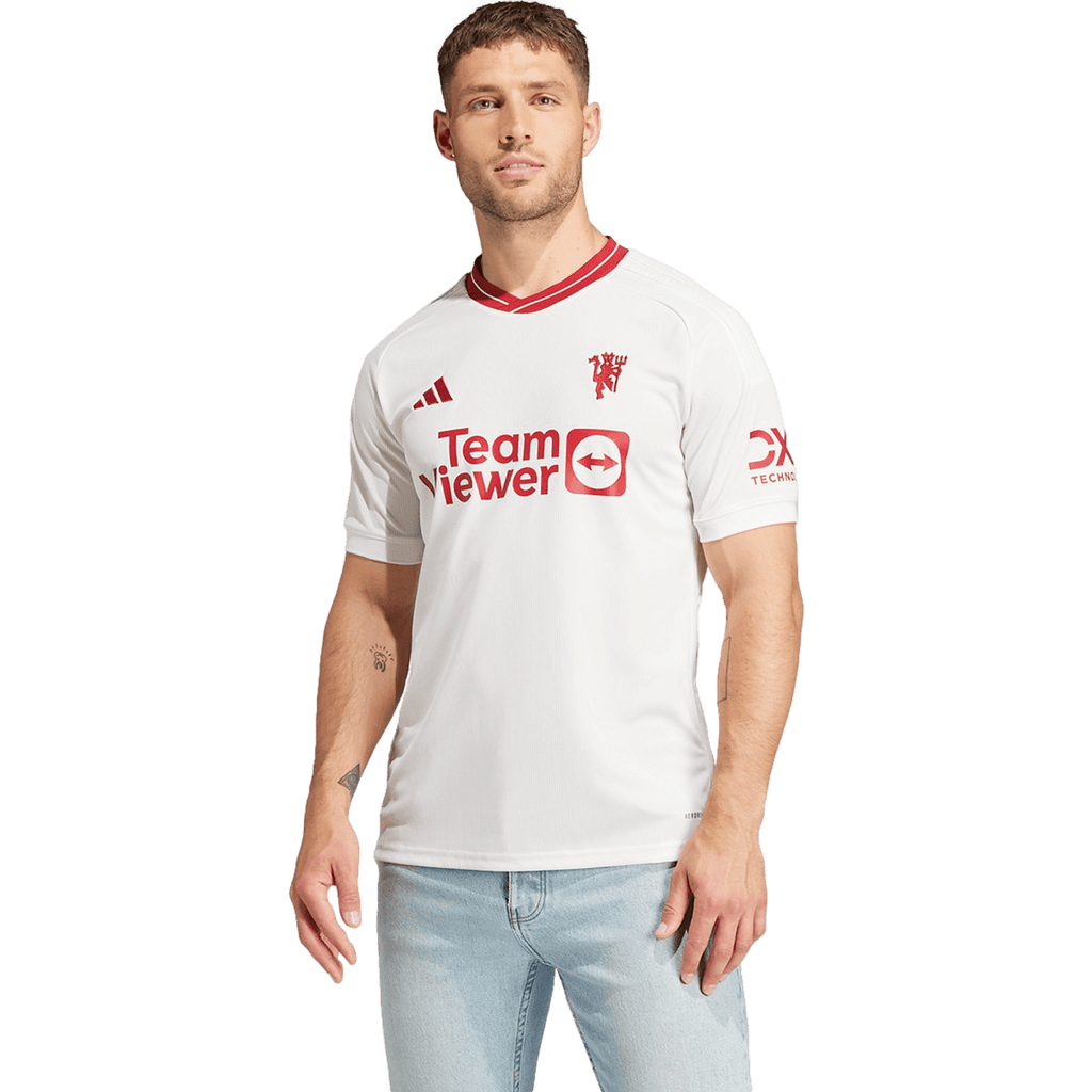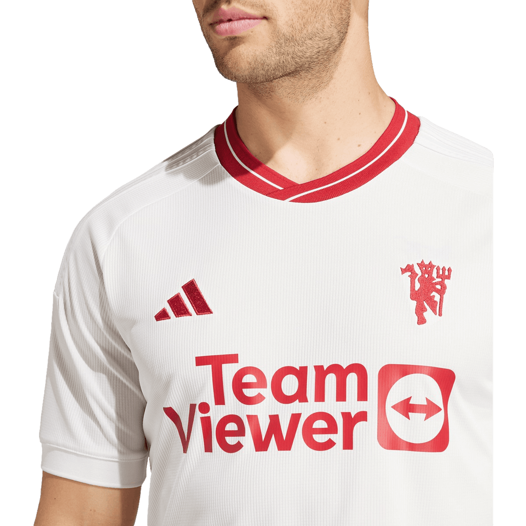 Celebrating half-a-century of the iconic red devil. Clean and classic, the Manchester United 23/24 Third Jersey lets one of soccer's most recognizable symbols shine with an eye-catching embroidered finish. Whether you're celebrating the club or are simply a fan of the beautiful game, this slim-fitting shirt combines mesh inserts with sweat-wicking AEROREADY to help keep you feeling dry. Made with 100% recycled materials, this product represents just one of our solutions to help end plastic waste.