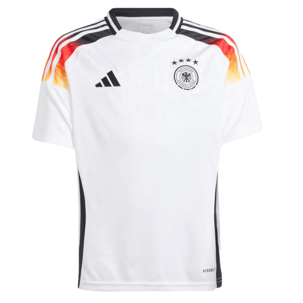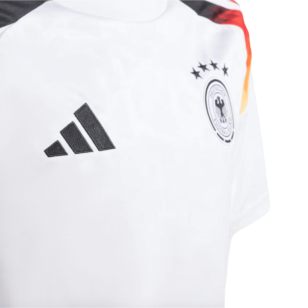Embodying the spirit of German soccer. This juniors' adidas Germany home jersey combines all the symbols of the four-time world champions. An eagle feather-inspired design decorates the shoulders and embossed details taken from the DFB logo repeat across the front. Made for comfortable support, this shirt features moisture-managing AEROREADY and a woven badge. This product is made with 100% recycled materials. By reusing materials that have already been created, we help to reduce waste and our reliance on finite resources and reduce the footprint of the products we make.