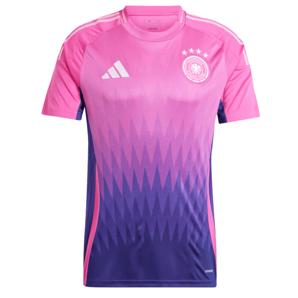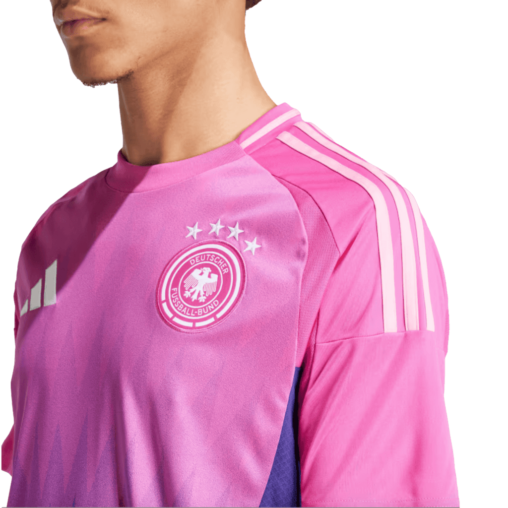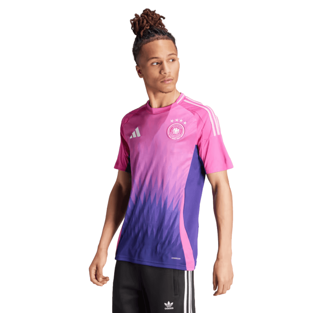 Traditional soccer fandom highlighted in a brand-new way. Finished in vibrant purples and blues, an eagle feather-inspired design rises up the chest of this adidas Germany away jersey. Moisture-managing AEROREADY and a premium woven team badge combine to make this the perfect shirt for comfortable support. This product is made with 100% recycled materials. By reusing materials that have already been created, we help to reduce waste and our reliance on finite resources and reduce the footprint of the products we make.