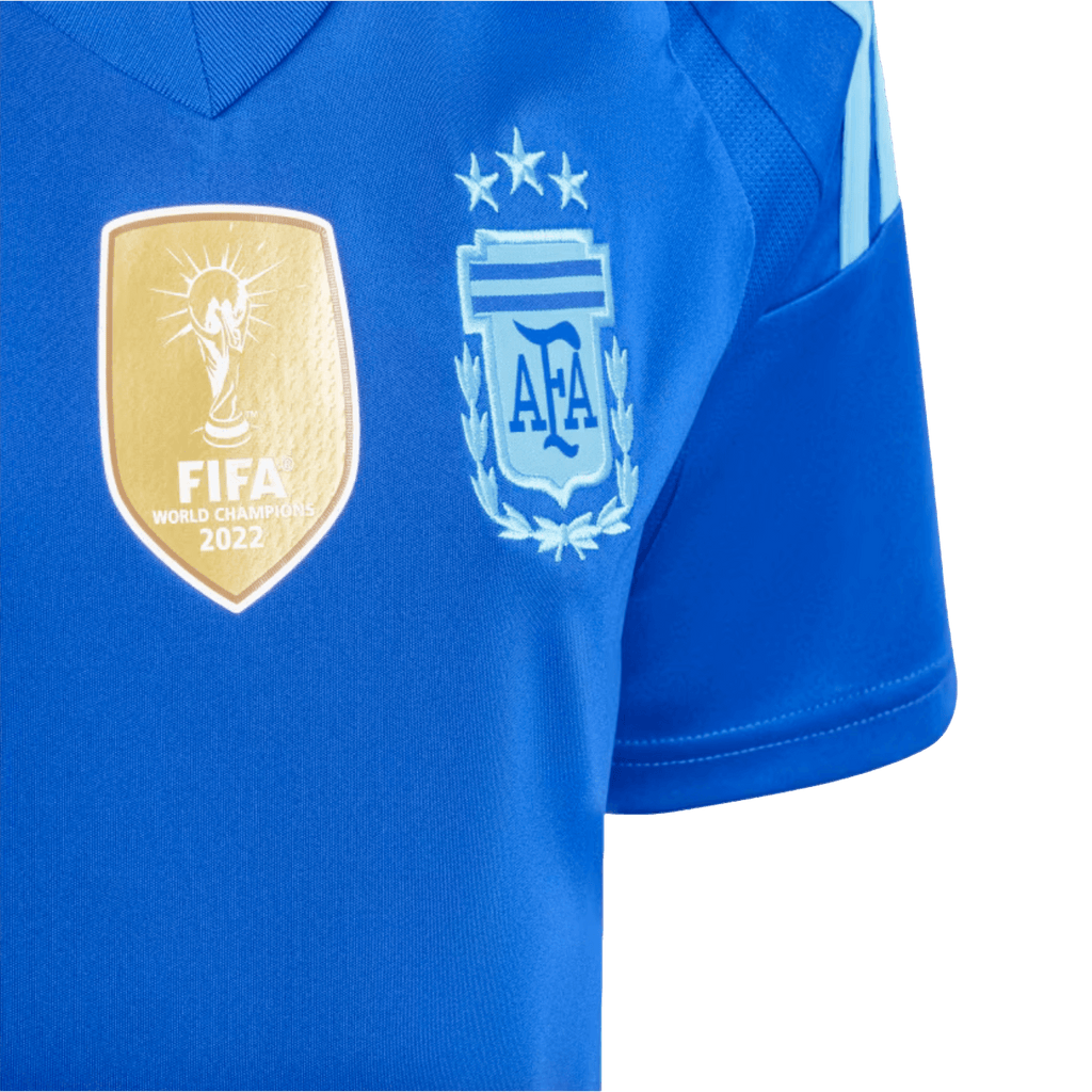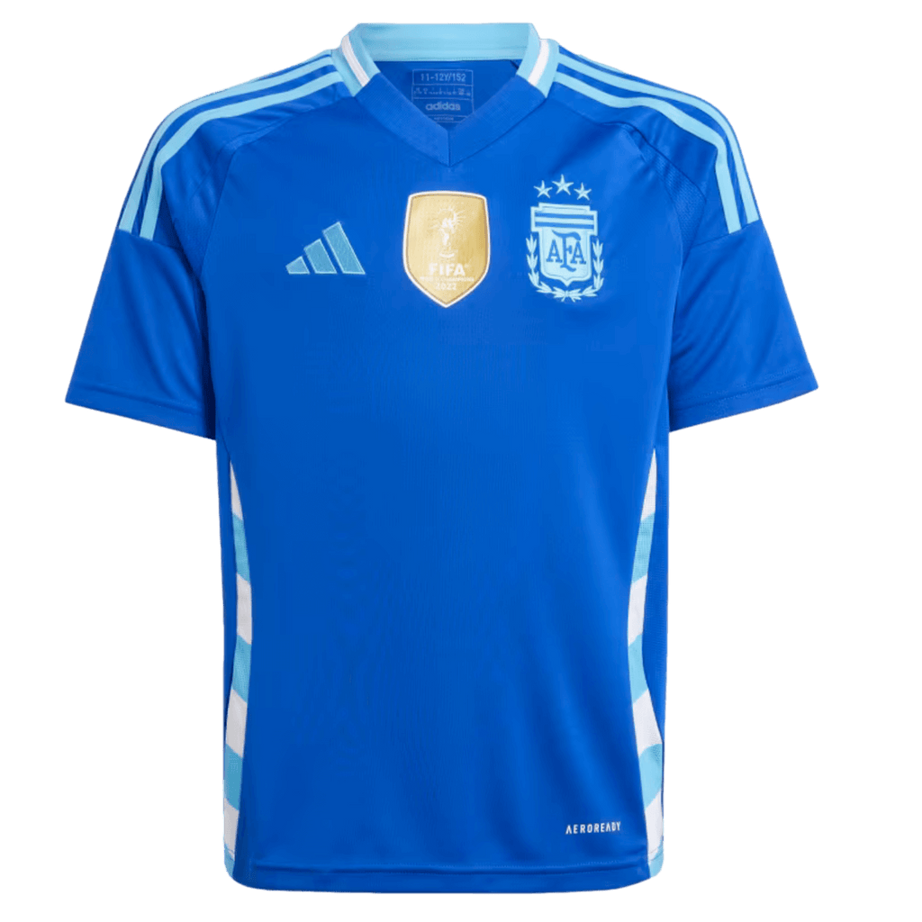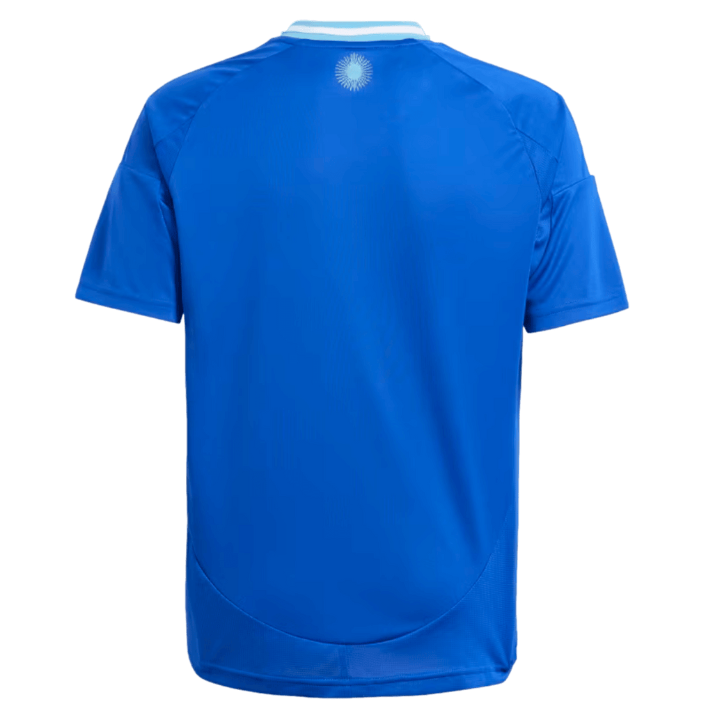 Rock Argentina's colors in a juniors' adidas away jersey inspired by the nation's music scene. Showing off metallic elements and an eye-catching shade of blue, this soccer shirt is designed to keep fans comfortable thanks to its mesh inserts and moisture-managing AEROREADY. A woven team crest takes center stage while you sing for your team. This product is made with 100% recycled materials. By reusing materials that have already been created, we help to reduce waste and our reliance on finite resources and reduce the footprint of the products we make.