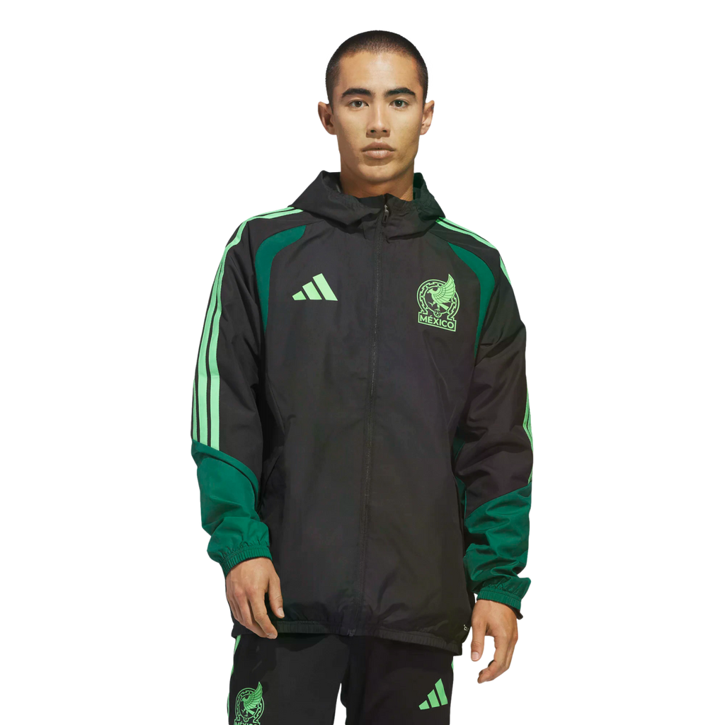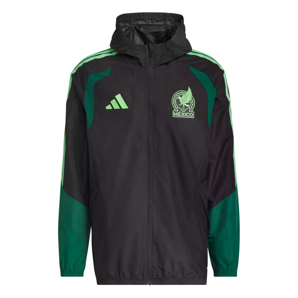 Inspired by the vibrant colors of the Home kit, the Mexico 26 Tiro All Weather Jacket seamlessly blends tradition with modern performance. It features Clima365 technology, a series of high-tech fabrics designed to keep you ready for sport. Whether you're training or cheering from the sidelines, this jacket's water-repellent and windproof fabric helps you feel dry and warm during light rain and windy conditions. A packable hood lets you easily adapt to changing weather, while a full zipper closure offers convenience. Laid-on 3-Stripes tape adds a touch of adidas heritage. Crafted with attention to detail, this jacket is made for those who embrace the spirit of football. Wear it proudly and feel the connection to Mexico, knowing you're part of a legacy that celebrates both style and performance.