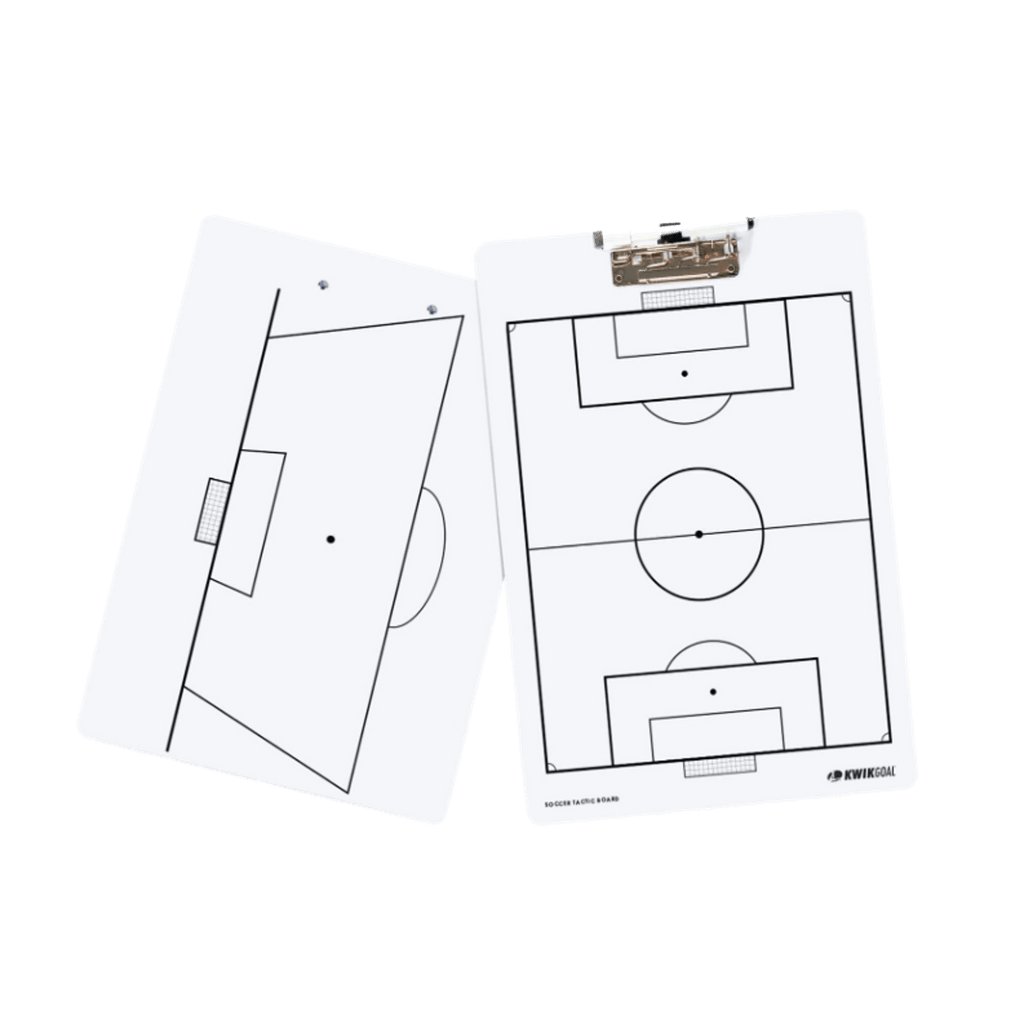 The 18B601 Kwik Goal Soccer Tactic Board provides space on both sides of the board. The main side features a full field and the back has an attacking/defending third.