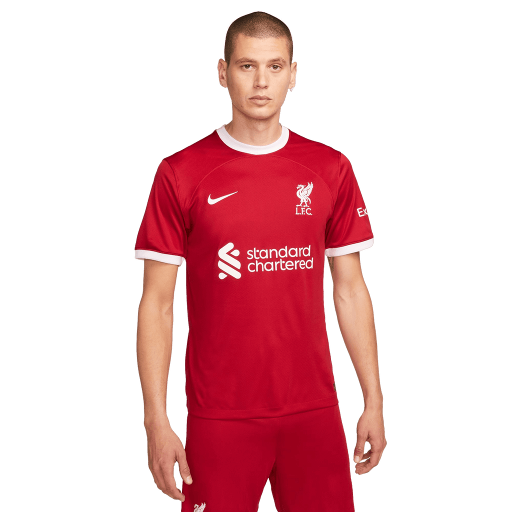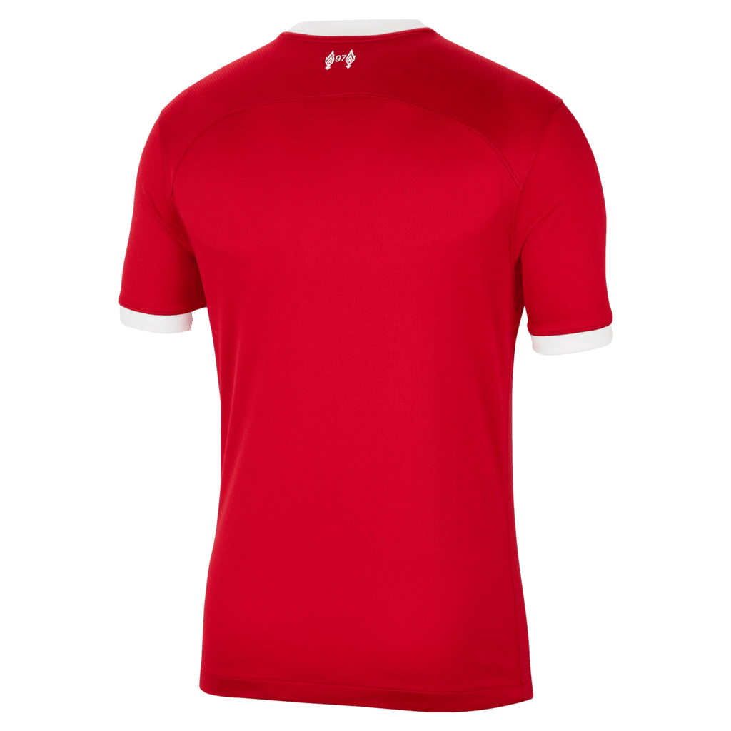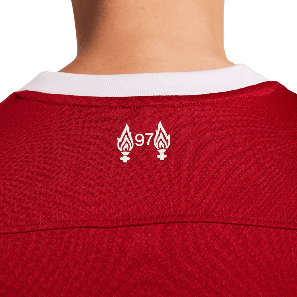 Packed with details, the Liverpool FC 2023/24 jersey remembers the 97 people who tragically died in the Hillsborough Disaster. A 97 set between two eternal flames resides on the inner pride while white accents at the collar and sleeves nod to a jersey the legendary ’74 squad wore. Our Stadium collection pairs replica design details with sweat-wicking technology to give you a game-ready look inspired by your favorite team.Nike Dri-FIT technology moves sweat away from your skin for quicker evaporation, helping you stay dry and comfortable.