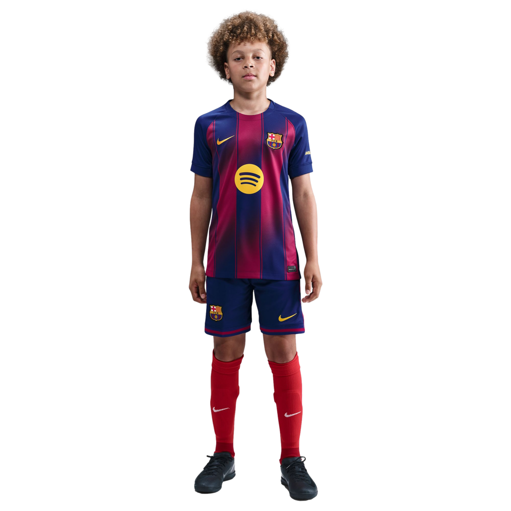 FC Barcelona's 2025/26 home jersey updates one of the most recognizable looks in soccer. Their iconic Blaugrana is fused with movement-inspired graphics and bright, energetic accents to celebrate their fans' unity and devotion to the club.